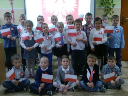 Symbole narodowe są bardzo dobrze znane przedszkolakom, co widać na zdjęciach. W związku ze świętami majowymi dzieci najpierw wysłuchały starszych kolegów i koleżanek a po akademii wykonały flagi, kolorowały godło Polski. Obejrzały przygotowaną przez IPN prezentację multimedialną o barwach i symbolach naszego kraju. Tak przygotowane mogły razem z rodzicami świętować 1, 2 i 3 Maja.